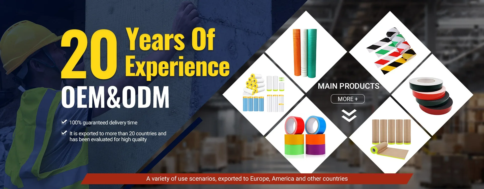 With 20 years of production experience, our company specializes in full-range adhesive tapes and fiberglass mesh cloth. We operate two factories, backed by over 100 production staff and a 20-strong sales team serving both domestic and international markets. Boasting professional expertise in production and packaging, we offer customization and OEM services.